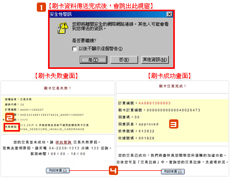 由於您的刷卡資料是在中國信託加密機制下傳輸,所以請放心資料不會外洩,當傳輸完成後,會跳出安全性警訊,此時請放心按下「是」,回到交易結果頁面。 |